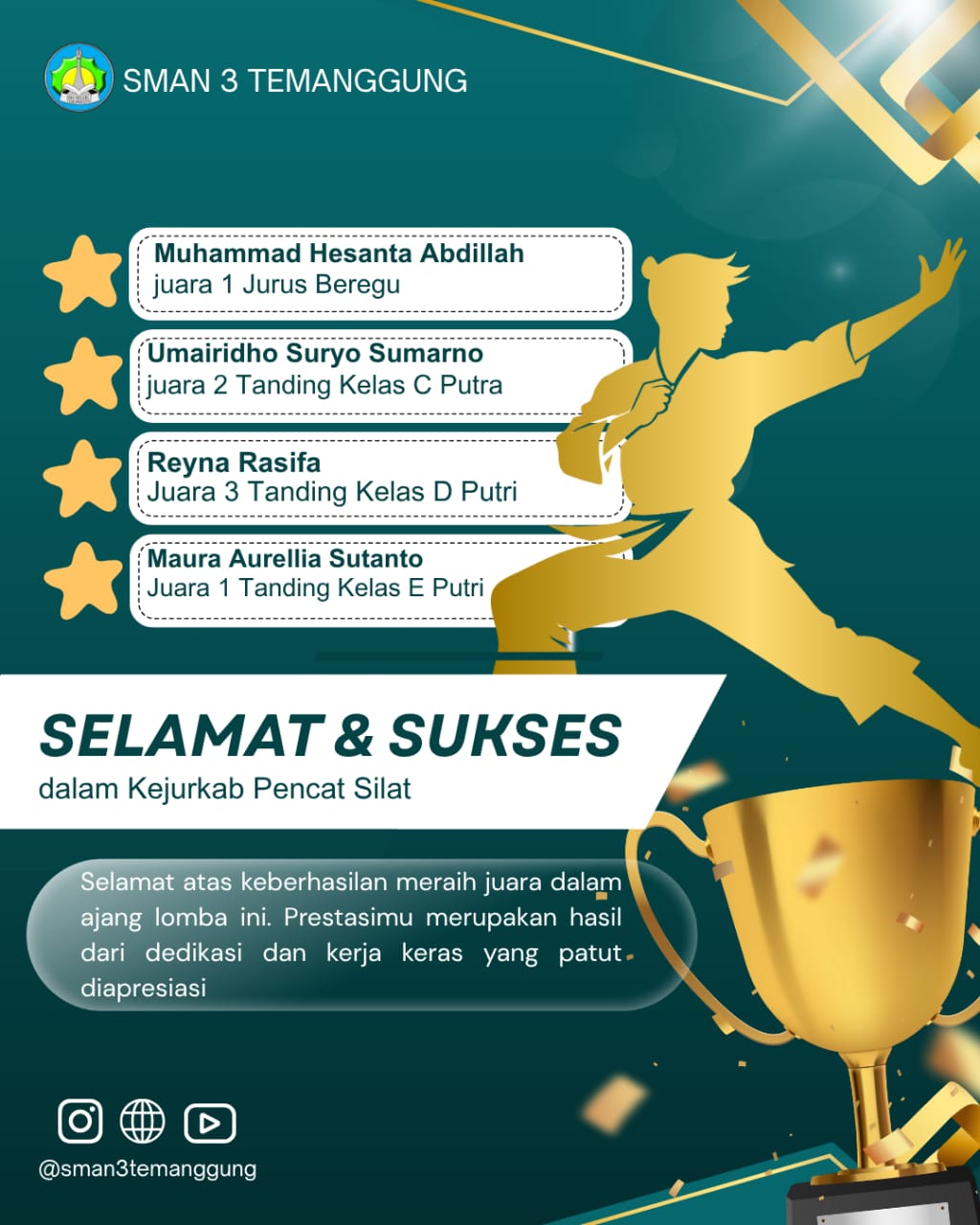 SMA Negeri 3 Temanggung kembali mencatatkan prestasi membanggakan di bidang olahraga. Pada Kejuaraan Daerah Kabupaten (Kejurkab) Pencak Silat yang digelar baru-baru ini.